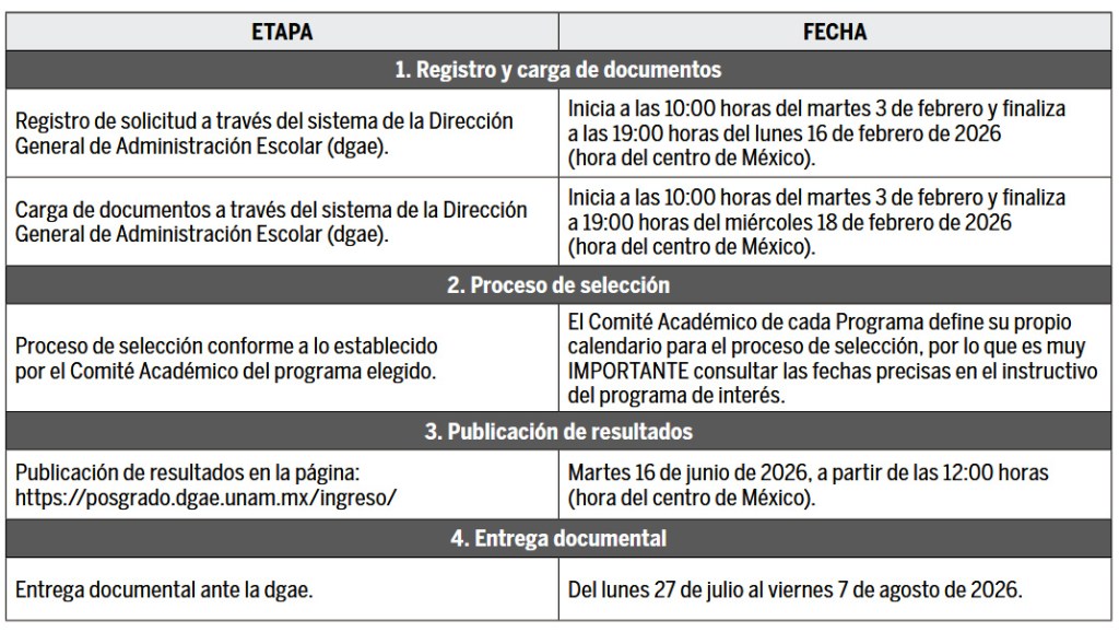 En apego a la Legislación Universitaria, de conformidad con el artículo 8° del Reglamento General de Estudios de Posgrado, las personas aspirantes interesadas en participar, deberán cumplir con todas las condiciones, requisitos, trámites y procedimientos, descritos en los INSTRUCTIVOS correspondientes a esta Convocatoria, mismos que estarán disponibles después del martes 18 de noviembre de 2025. Para consultarlos, deberán ingresar a la página web de la Coordinación General de Estudios de Posgrado, y dar clic al plan de estudios de interés, en la sección oferta académica: https://www.posgrado.unam. mx/oferta-academica/. Para participar, las personas aspirantes deberán: 1. 2. 3. 4. 5. 6. 7. 8. Leer por completo y aceptar los términos y condiciones de esta Convocatoria, del Instructivo y del plan de estudios del programa de posgrado correspondiente. Realizar su registro al proceso de selección e ingreso en la página https://posgrado.dgae.unam.mx/ingreso/ en las fechas establecidas para tal efecto en esta Convocatoria, en el entendido de que al registrarse al proceso de selección e ingreso aceptan, en su totalidad y sin excepción alguna, los términos y condiciones de esta Convocatoria y sus Instructivos. Atender los trámites y procedimientos de cada una de las etapas establecidas en el Instructivo del programa de posgrado correspondiente, en las fechas que al efecto se señalen. En el caso de haber realizado estudios en el extranjero, prever con antelación todos los trámites relacionados con el apostille o legalización de sus documentos académico-administrativos, a fin de poder presentarlos en la etapa documental correspondiente, acorde a los tiempos establecidos en la presente Convocatoria y sus Instructivos. Además, sin excepción, deberán anexar la constancia de equivalencia del promedio general, emitida por la Dirección General de Incorporación y Revalidación de Estudios (DGIRE) de la UNAM. Consultar la página: https://www.dgire.unam.mx/index.php/informacion/ revalidacion Cumplir con el proceso de selección e ingreso establecido por el Comité Académico del programa correspondiente, con base en los requisitos y criterios académicos de ingreso previstos en el plan de estudios seleccionado, en sus normas operativas y en el Instructivo de la Convocatoria. Consultar los resultados del proceso de selección e ingreso, a partir de las 12:00 horas del martes 16 de junio de 2026, (hora del centro de México), ingresando a la página https://posgrado.dgae.unam.mx/ingreso/ En caso de ser aceptadas por el programa de posgrado elegido, realizar los trámites académico–administrativos, de acuerdo con lo señalado por parte del programa de posgrado en el que hayan sido aceptadas. Corresponderá única y exclusivamente a las personas aspirantes extranjeras llevar a cabo todos los trámites migratorios que le sean solicitados por las autoridades migratorias correspondientes, sin que esta Universidad tenga alguna responsabilidad sobre ello.