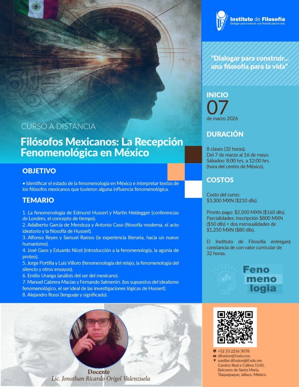 Extendemos la invitación al curso a distancia “Filósofos Mexicanos: la recepción fenomenológica en México” por parte del Instituto de Filosofía. El curso será impartido por el Lic. Jonathan Ricardo Origel Valenzuela, miembro activo del CMPF A.C.